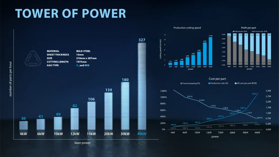 In this example, the same 15mm mild steel part has been cut with different powers, from 4kW up to 40kW to show how an increase in power drastically increases productivity and profit.